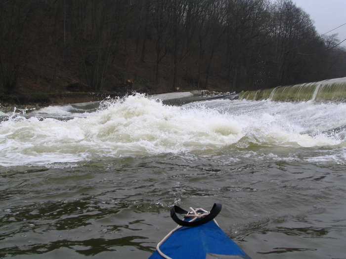 das Wehr in Döbritschen (bei diesem Wasserstand wäre die Befahrung der neuen Bootsrutsche lebensgefährlich)